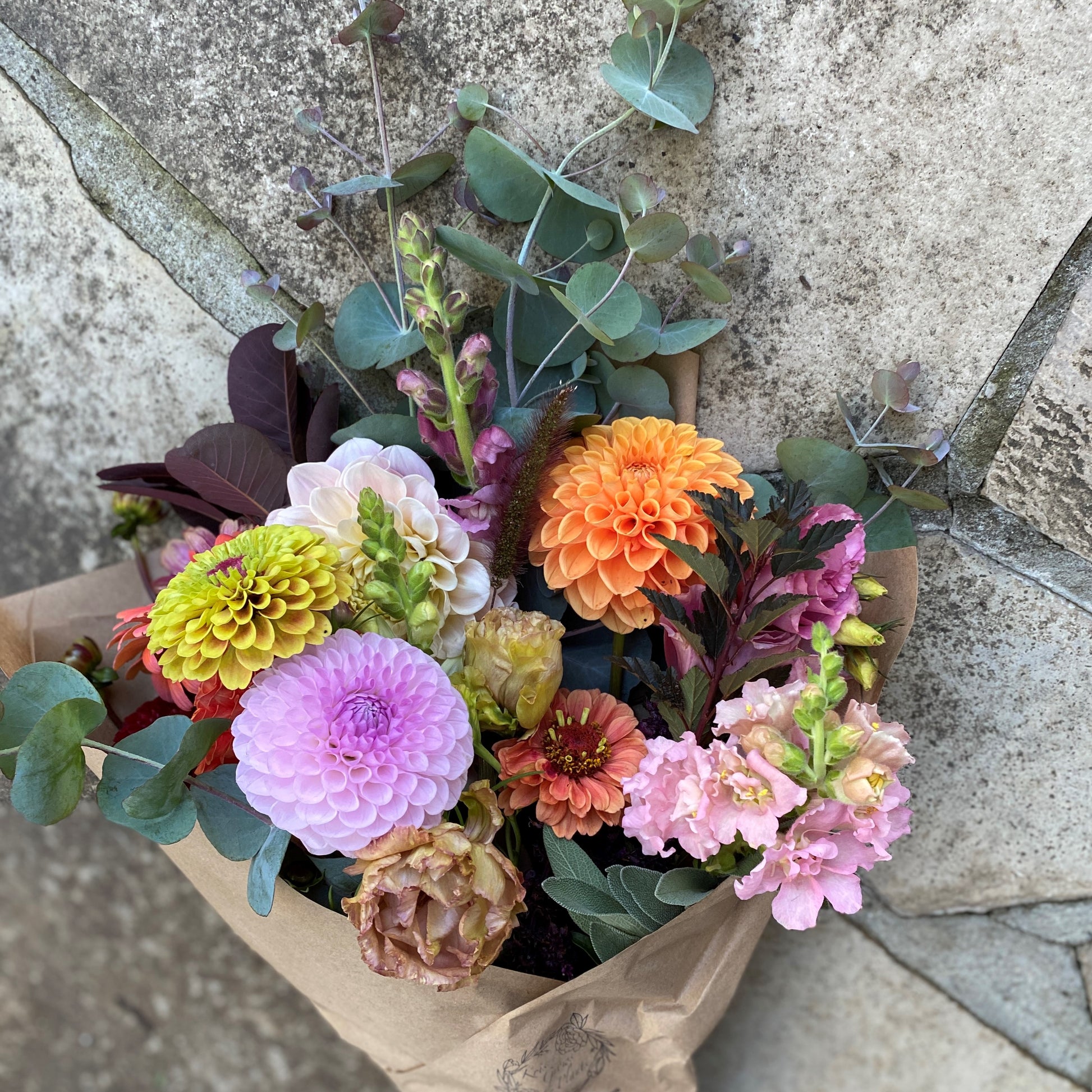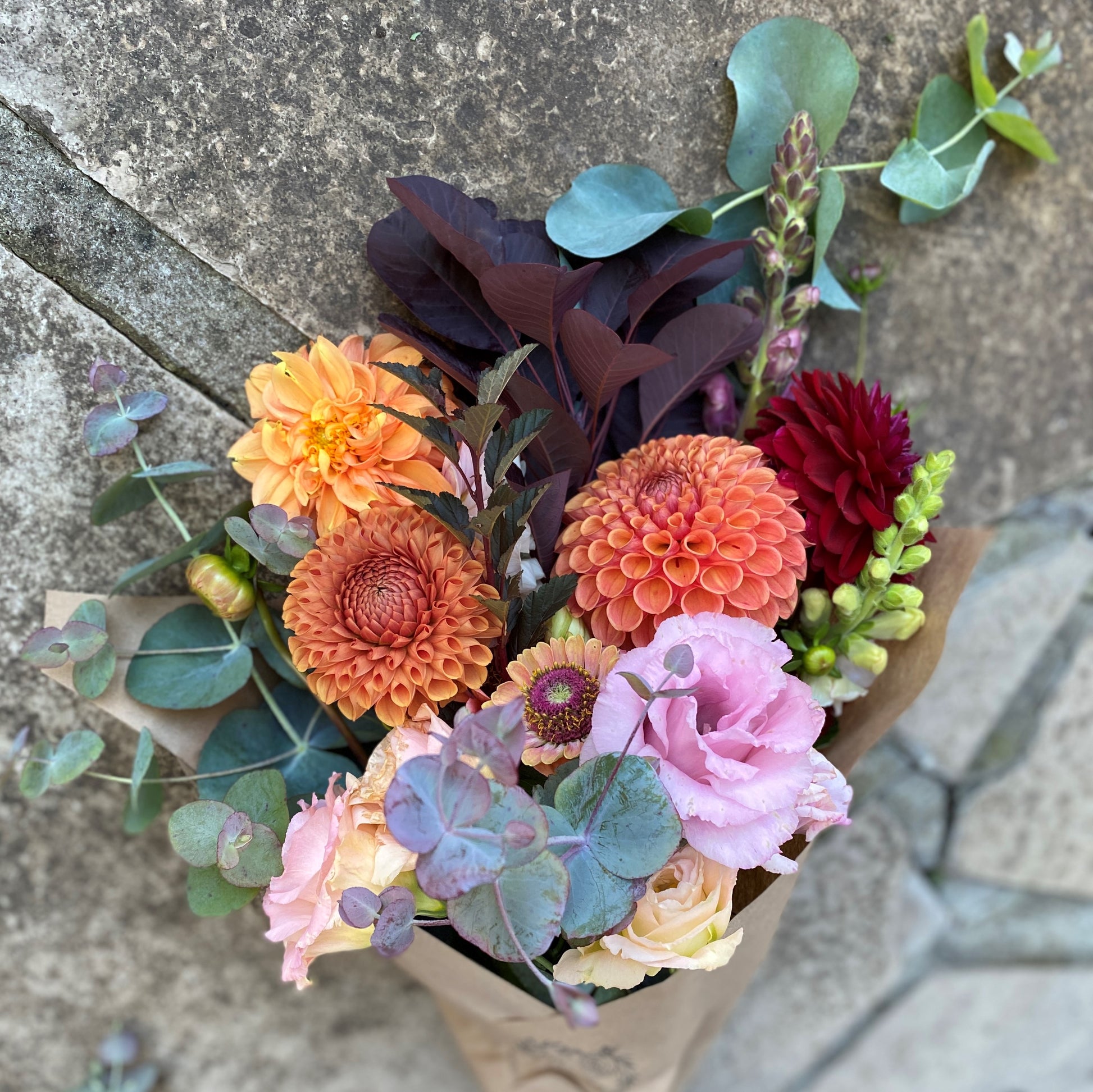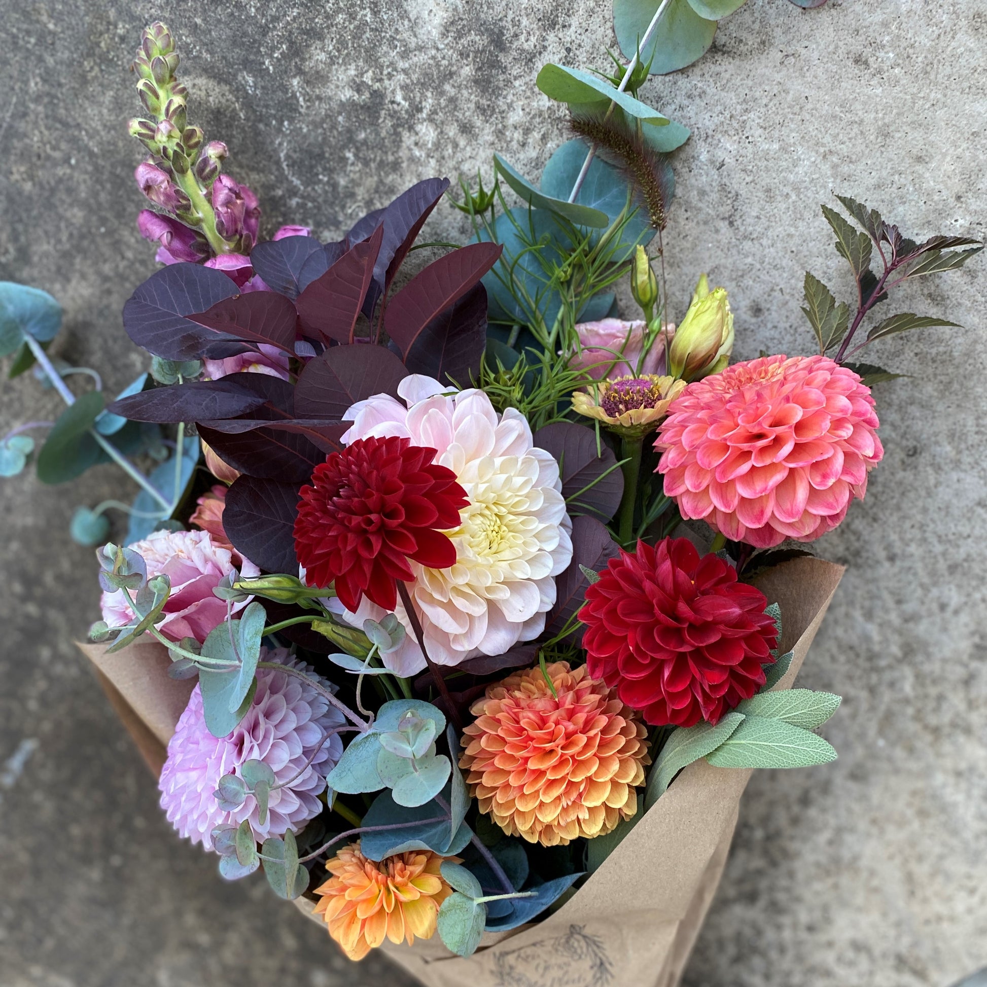 This freshly-cut seasonal bouquet features a luxurious Autumn palette of dahlias, zinnias, Lisianthus, and a dramatic mix of deep burgundy foliage, eucalyptus, grasses and fragrant herbs, including a large sprig of white sage for your harvest feast. Perfectly imperfect, rustic, and just right for your table.